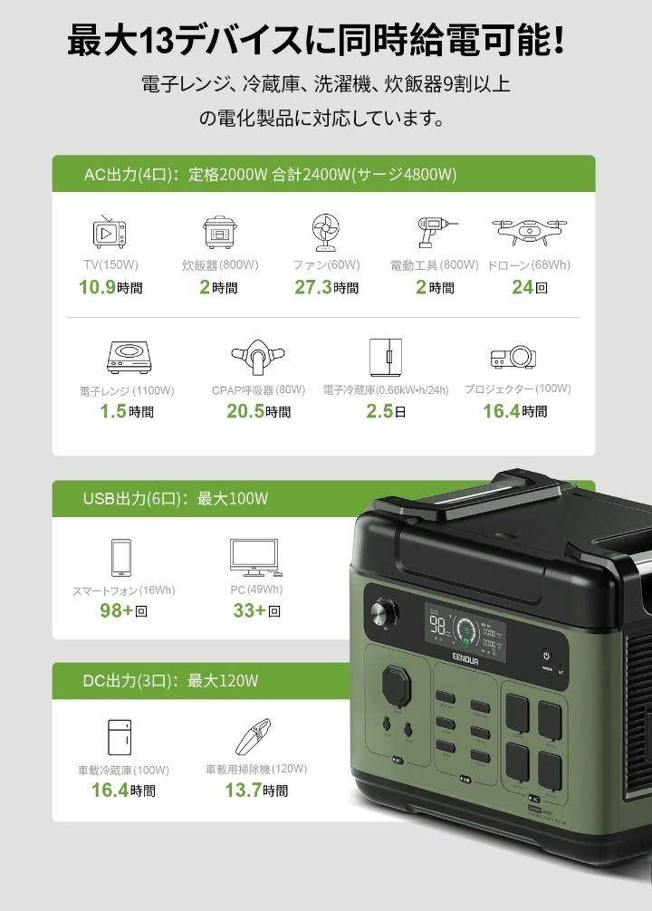 【楽天市場】【お買い物マラソン限定価格で84,990円】進化版・APP対応 EENOUR P2001PLUS ポータブル電源 2400W 2048Wh リン酸鉄 AC入力調整 大容量 UPS機能 急速充電 蓄電池 家庭用 防災対策 発電機 ポータブルバッテリー ソーラーパネル別売 正弦波:EENOUR 楽天市場店