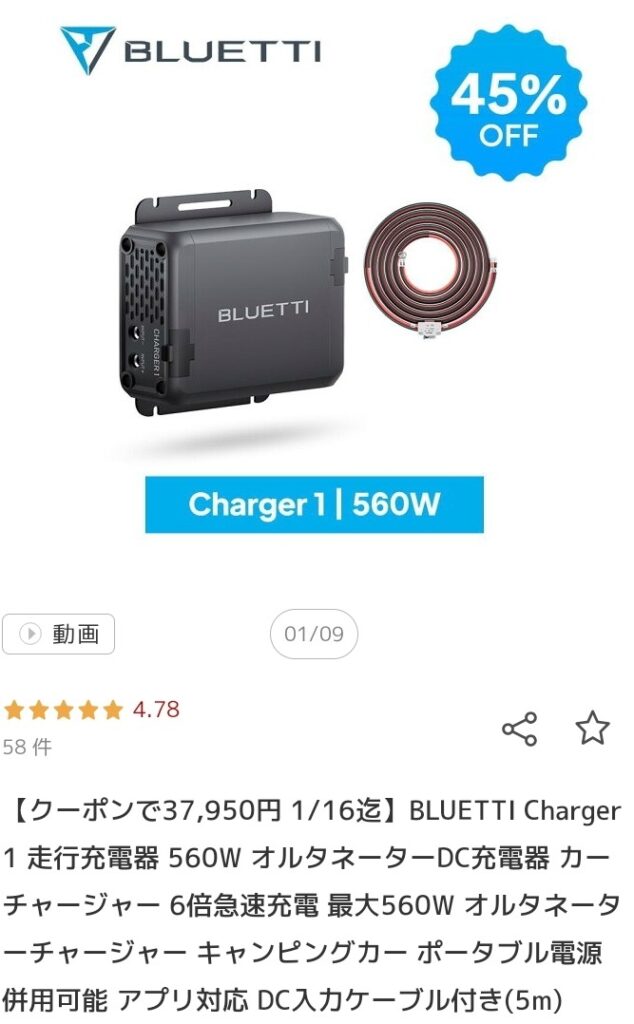 【楽天市場】【クーポンで37,950円 1/16迄】BLUETTI Charger 1 走行充電器 560W オルタネーターDC充電器 カーチャージャー 6倍急速充電 最大560W オルタネーターチャージャー キャンピングカー ポータブル電源併用可能 アプリ対応 DC入力ケーブル付き(5m):BLUETTI JAPAN 楽天市場店