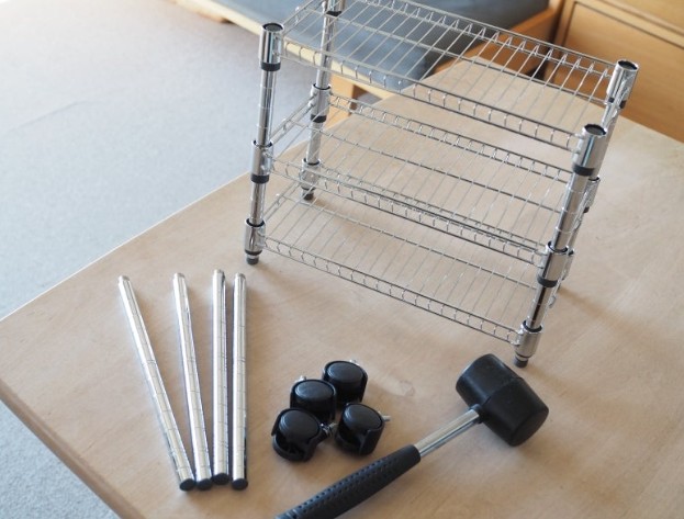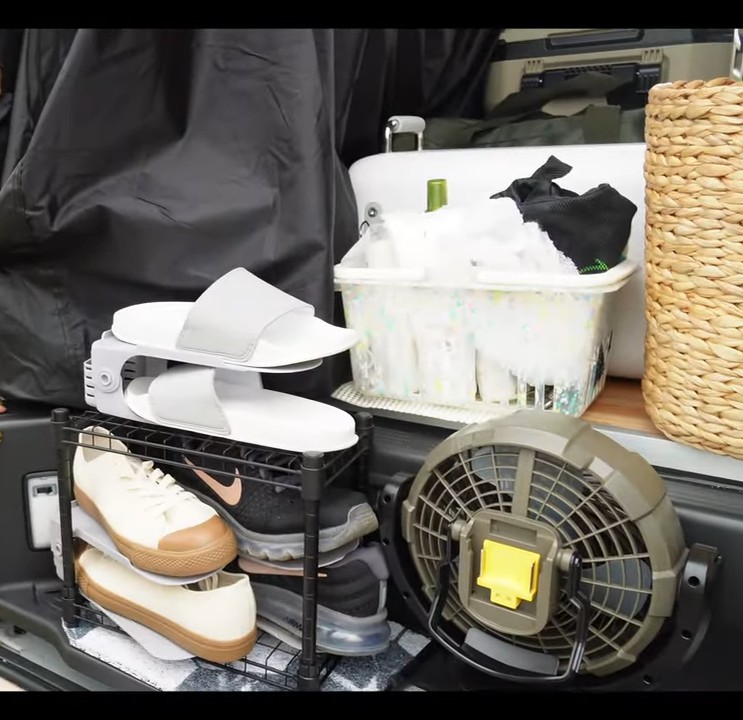 100均の、スチールラックを必要な大きさで組み立てて、サイドのステップに置いて使います。この写真では、靴を省スペースでおけるグッズを利用して、うまくラックに納めています。実際は乗り降りの時に足元に気を付ければ、限られた空間を有効利用できる方法だと思いました。
